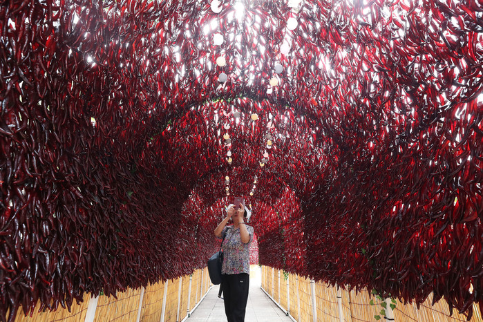 '영양고추 핫 페스티벌'이 열린 27일 서울광장에서 시민이 고추로 만든 터널을 촬영하고 있다. 행사는 80여개 농가와 영양고추유통공사, 영양농협, 남영양농협 등 우수 고춧가루 가공 업체가 참여해 29일까지 진행한다.