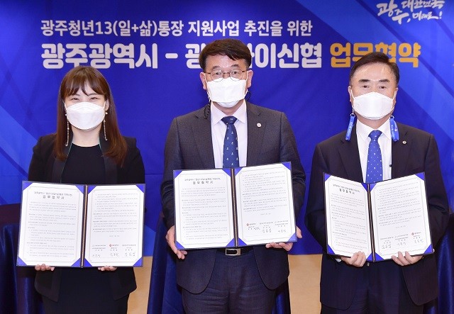 지역조합인 광주와이신협은 코로나19가 지속되면서 불안정한 근로환경에 놓인 근로 청년들을 위해 15일 시청에서 광주시, 청년금융복지지원센터와 ‘청년13(일+삶)통장 지원 사업’ 추진을 위한 업무협약을 체결하고 후원금을 기탁했다.