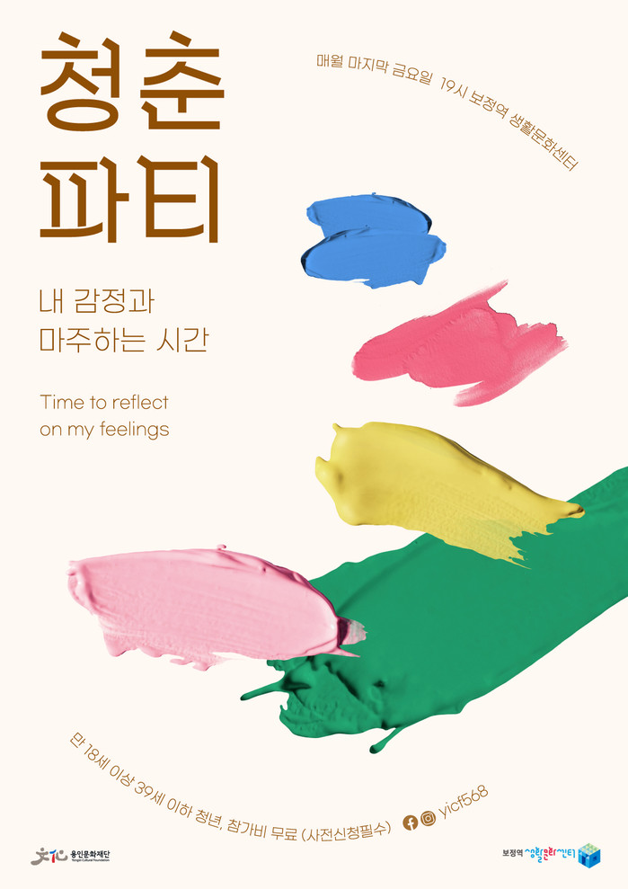 용인시 청년 네트워킹 프로그램인 <청춘파티>는 2016년부터 일상 속 청년들의 다양한 이야기를 함께 나눌 수 있는 토크 콘서트로 기획됐다. 올해는 6월부터 11월까지 매주 다양한 감정을 팔레트 속 색깔과 매칭 하여 마지막 주 금요일 온라인 ‘컬러링 토크 콘서트’형식으로 운영되며, 10월에는 ‘붉은 색’을 테마로, ‘열정과 두려움 사이’에 대해 시각 장애 유투버 ‘우리 정인이’ 와 함께 교류하는 시간을 갖는다.