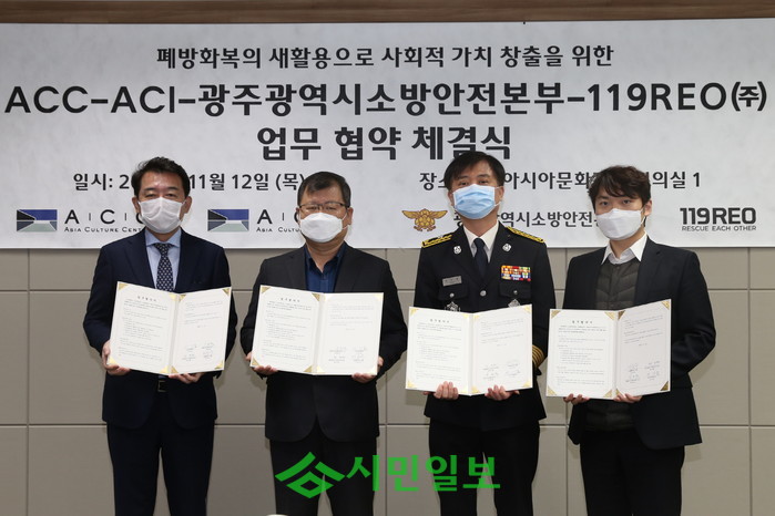 광주광역시 소방안전본부는 12일 국립아시아문화전당에서 폐방화복을 재활용해 새 상품으로 제작하는 119REO㈜와 국립아시아문화전당, 아시아문화원과 폐방화복 활용 관련 업무협약을 체결했다.