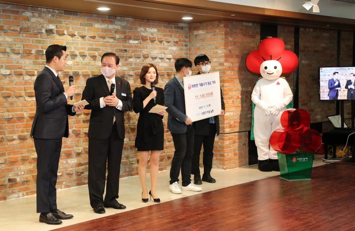 서울 마포구가 19일 서울사회복지공동모금회·마포구지역사회보장협의체와 함께 구 유튜브 채널을 통해 ‘언택트 모금 생방송’을 열어 모금행사를 널리 홍보하고 참여를 독려했다. 사진은 유동균 구청장(왼쪽 두 번째)이 구 직원들과 함께 모금한 성금을 기탁하며 방송 진행자들과 인터뷰를 하고 있는 모습. (사진제공=마포구청)