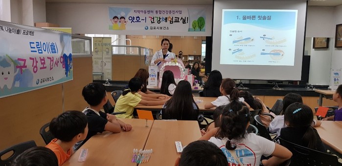 경기 김포시는 26일까지 한 달간 지역내 16개 지역아동센터 아동 362명을 대상으로 통합건강 증진을 위한 ‘얏호! 건강체험교실’을 운영했다. 체험교실에서는 올바른 잇솔질 방법 등의 맞춤형 구강보건 교육이 진행됐다. 사진은 교육 진행 모습. (사진제공=김포시청)