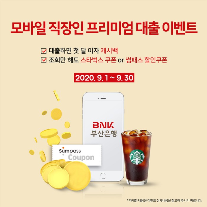 ‘직장인 프리미엄대출’ 한도 조회를 한 고객에게는 스타벅스 커피 기프티콘 또는 부산은행 모바일 간편결제 서비스인 ‘썸패스’ 할인 쿠폰(5000원권)을 증정한다. 이벤트는 선착순으로 진행되며 총 3000명에게 혜택을 제공할 예정이다.