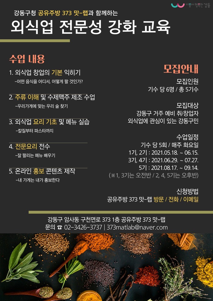 맛있는 연구소를 표방하는 공유주방 「373 맛-랩」은 외식업 (예비)창업자에게 음식 관련 새로운 시도와 경험을 지원하는 외식업창업 지원공간으로써 강동구 구천면로 373에 있다.