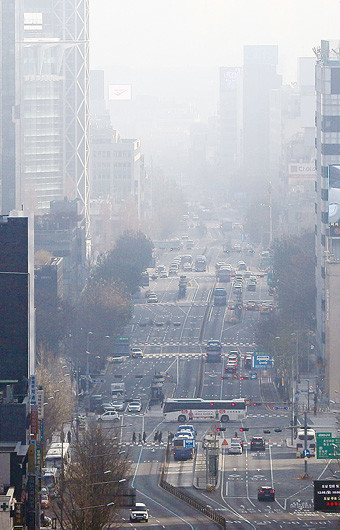 농도가 나쁨 수준을 보인 8 오전 서울 도심 일대가 뿌옇게 보이고 있다.