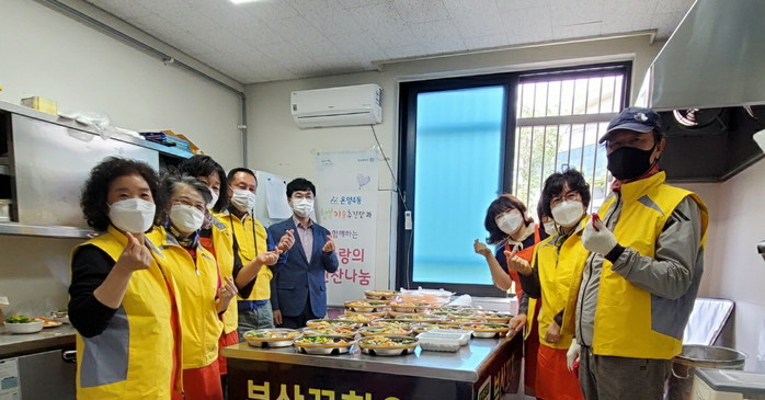 충남 아산시 온양4동 행복키움추진단은 최근 아산웰빙푸드의 후원으로 30가구분 반찬을 추가로 제공받아 지역내 소외계층 50가구를 위한 '사랑의 반찬나눔 행사'를 개최했다. 사진은 이날 봉사자들이 기념촬영을 하는 모습. (사진제공=아산시청)