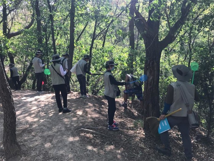 서울 강북구도시관리공단은 최근 북한산 국립공원내 강북구 관할 주요 등산로 및 북한산 둘레길 매미나방 방제에 나섰다. 매미나방은 각종 침엽수와 과목류의 잎을 갉아먹어 산림 피해를 준다. 사진은 참여자들이 환경보호에 기여하고자 매미나방 유충 방제를 하고 있는 모습. (사진제공=강북구청)