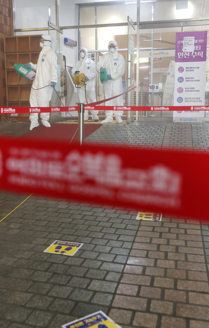 코로나19 확진자가 급증하고 있는 가운데 18일 오전 서울 영등포구 여의도순복음교회에서 방역 관계자들이 소독작업을 하고 있다. 최근 교인과 가족 3명이 코로나 19 양성 판정 받은 여의도순복음교회는 향후 2주간 모든 예배를 온라인으로 전환하기로 했다고 밝혔다.