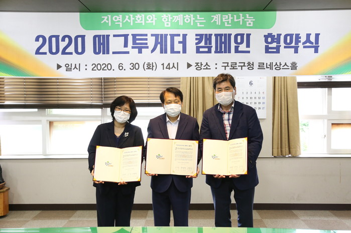서울 구로구가 계란자조금관리위원회, (사)따뜻한 마음과 최근 ‘에그투게더 캠페인’ 협약을 체결했다. 이 캠페인은 계란 나눔을 통해 소외계층의 영양상태를 증진하기 위한 사업이다. 사진은 협약식에서 이성 구청장(가운데)과 관계자들이 기념촬영을 하는 모습. (사진제공=구로구청)