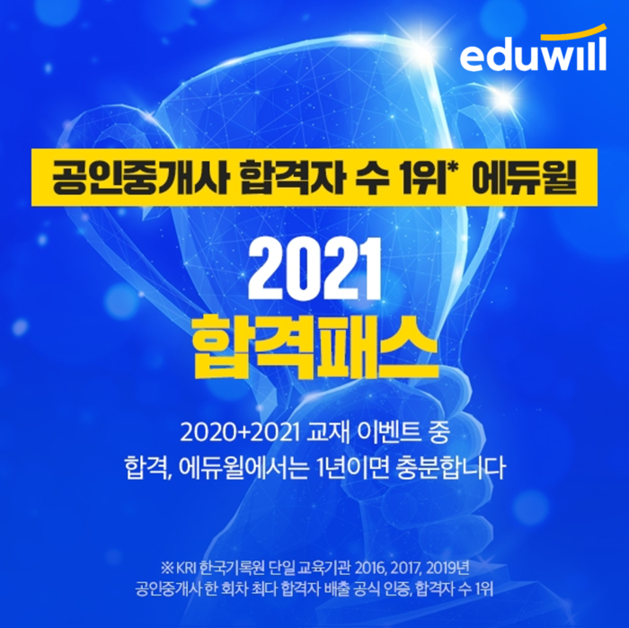 [시민일보 = 여영준 기자] 종합교육기업 에듀윌(대표 박명규)이 2021년 시험일까지 공인중개사 전 강좌를 무제한 수강할 수 있는 ‘2021 합격패스’를 선보였다.