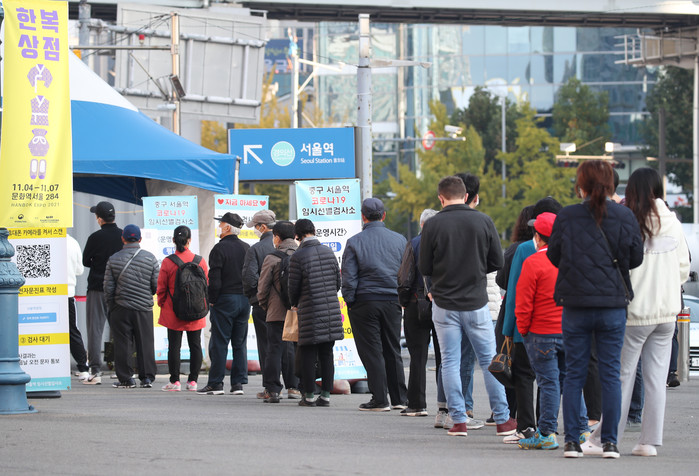 코로나19 신규 확진자 수가 1423명을 기록한 24일 오전 서울 중구 서울역 코로나19 임시 선별검사소에서 시민들이 검사를 기다리고 있다.