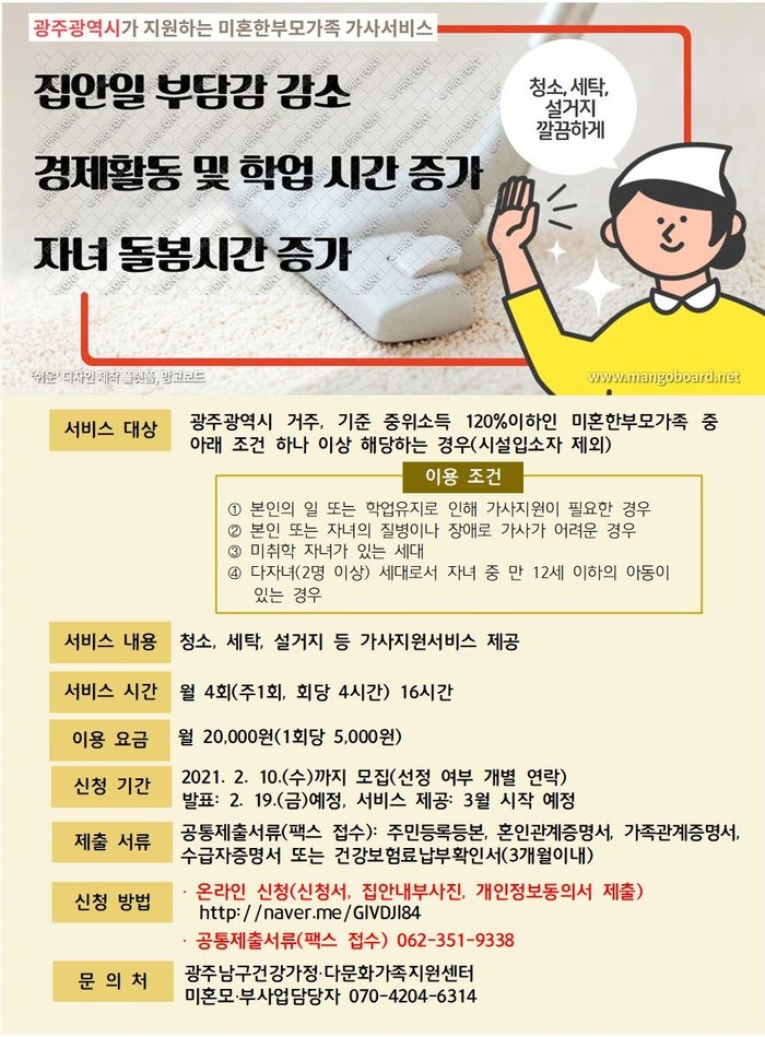 | ▲ 광주광역시 2021년 한부모가족 가사지원서비스 안내 이미지 / 광주광역시 제공 |