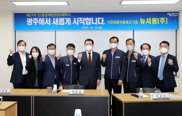 [광주=정찬남 기자] 이용섭 광주광역시장은 16일 제27차 민생경제 현장으로 전자제품 부품 생산기업인 뉴서광㈜(대표 이상섭)을 찾아 근로자를 격려하고 기업운영 애로사항을 청취 했다.