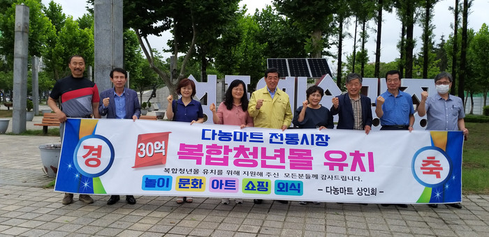 윤화섭 경기 안산시장이 최근 ‘복합청년몰 지원사업’에 선정된 다농마트 상인회를 찾아 간담회를 개최했다. 다농마트 전통시장은 오는 2021년까지 문화체험을 겸한 판매시설 조성, 휴게공간 조성, 소비와 즐길거리가 어우러진 콘텐츠 개발, 청년 일자리 창출 등을 추진할 계획이다. 사진은 윤 시장(가운데)과 상인회 회원들이 기념촬영을 하는 모습. (사진제공=안산시청)