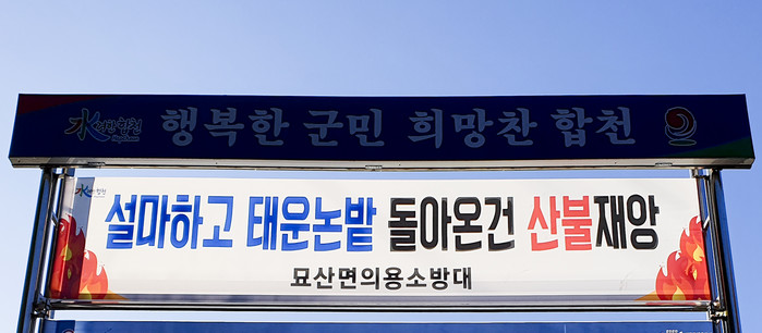 경남 합천군 묘산면(면장 홍석천)은 2020년 가을철 ~ 2021년 봄철 산불종합대책 기간이 본격적으로 시작되기 앞서 이장단외 3개 사회단체로부터 홍보 현수막 4점을 기증받아 게시했다고 밝혔다.