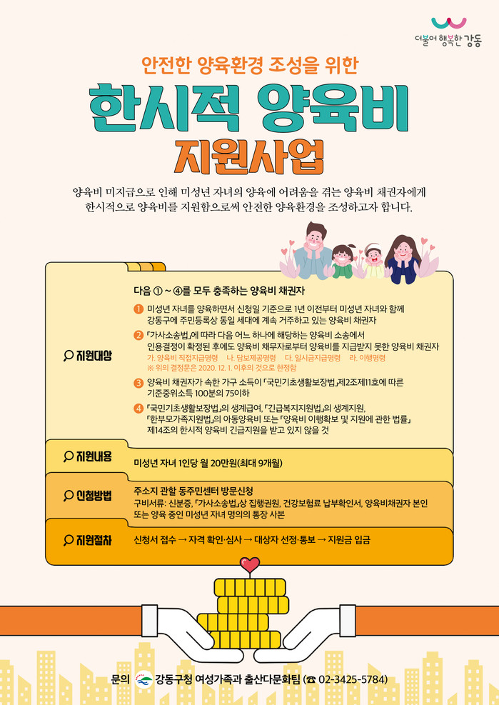또, 서울시 최초로 ‘한시적 양육비 지원 사업’을 시행해 양육비 미지급으로 인해 미성년 자녀의 양육에 어려움을 겪는 양육비 채권자에게 한시적으로 양육비를 지원한다. 지원 대상자에게는 미성년 자녀 1인당 월 20만원씩 최대 9개월 지원한다.
