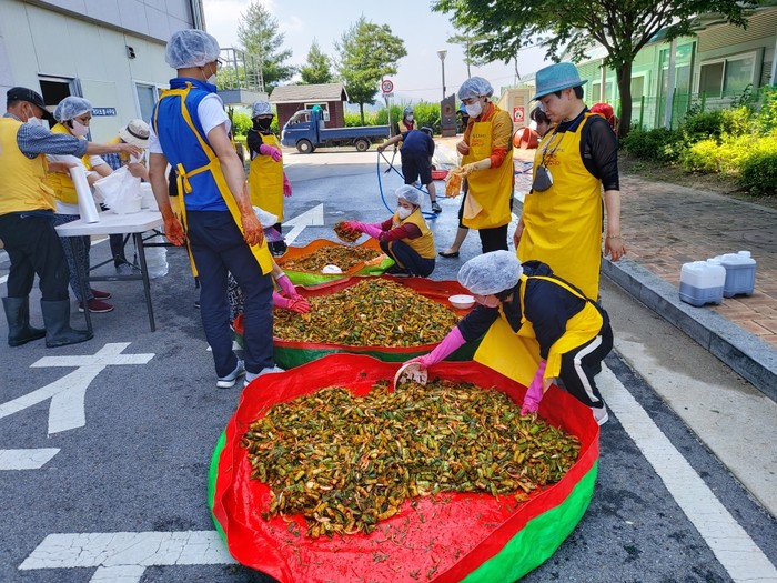 경기 포천시 영북면적십자봉사회는 최근 지역에서 생산한 재료를 이용해 열무와 얼갈이 김치를 만들어 소외계층 노인 130가구에 전달하는 사랑의 밑반찬 열무·얼갈이 김치 나눔행사를 추진했다. 사진은 이날 참가한 봉사자들이 김치를 만들고 있는 모습. (사진제공=포천시청)