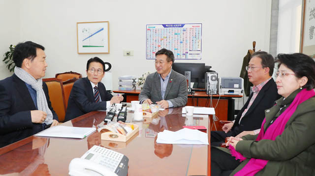 김관영 최고위원(왼쪽부터), 정의당 윤소하 원내대표, 더불어민주당 윤호중 사무총장, 대안신당 유성엽 창당준비위원장, 민주평화당 박주현 의원이 8 오전 서울 여의도 국회에서 열린 여야 4+1 선거법 협의체 회의에서 이야기를 나누고 있다.