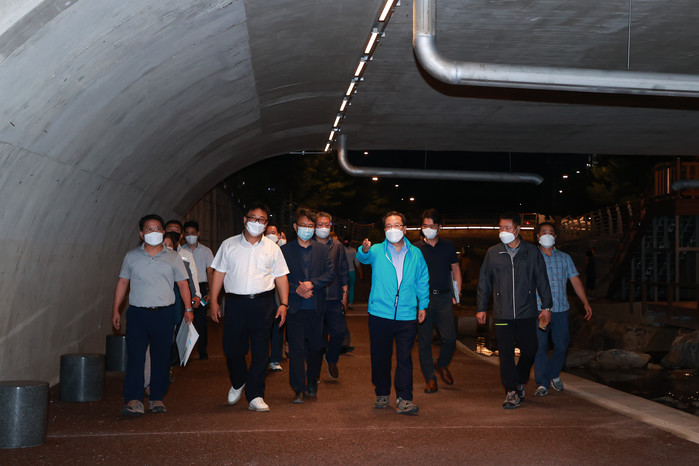 조광한 경기 남양주시장은 30일 화도읍 마석우리 244-2번지 일원에 조성 중인 마석우천 그린웨이 사업 현장을 방문해 사업 구간을 왕복으로 걸으며 개선사항 및 보완점에 대한 의견을 전달했다. 사진은 조 시장(가운데)이 관계자들과 산책로를 걷고 있는 모습. (사진제공=남양주시청)