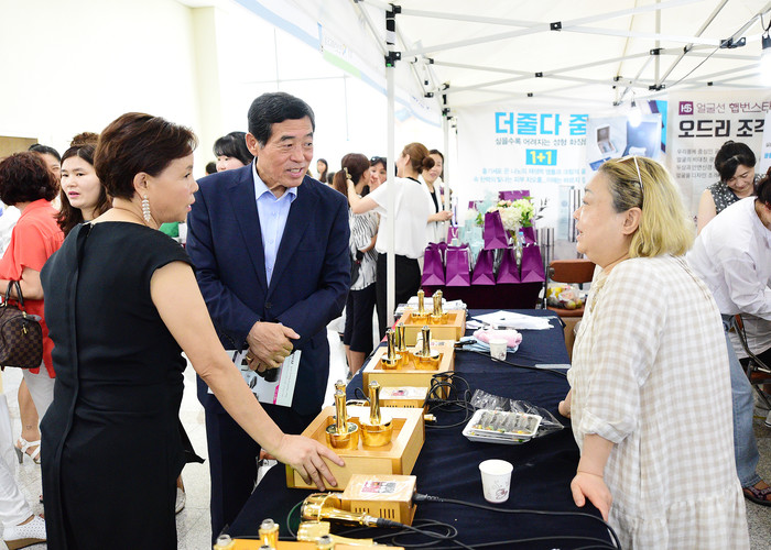 한국피부미용사회 경기도지회는 1일 경기도 피부미용 기자재박람회 및 위생교육을 경기 안산시 소재 신안산대학교 체육관에서 진행했다. 사진은 이날 박람회에 참석한 윤화섭 시장(왼쪽 두 번째)이 전시부스를 둘러보며 관계자들과 대화하는 모습. (사진제공=안산시청)