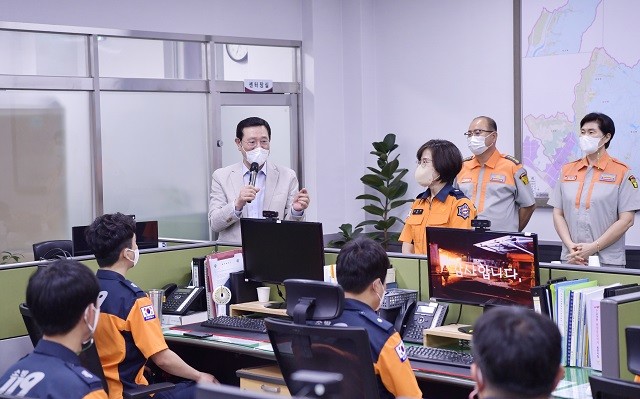 [광주=정찬남 기자] 이용섭 광주광역시장은 추석연휴 마지막날인 22일 112종합상황실, 광산소방서, 시청 선별검사소를 차례로 방문해 추석 연휴기간 특별방역 및 시민생활안정대책 추진으로 휴일도 반납하고 비상근무를 한 근무자를 격려했다.