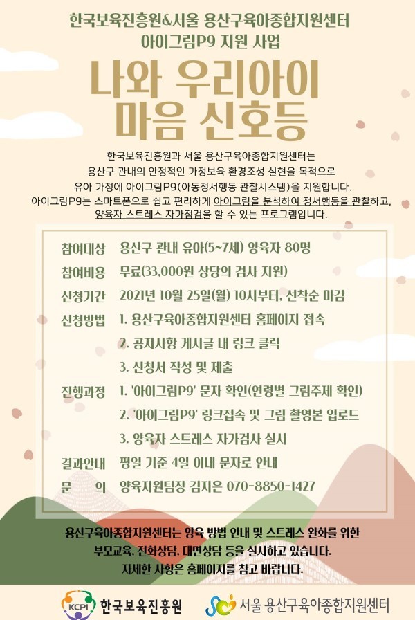 [시민일보 = 홍덕표 기자] 안정적인 가정보육 환경 조성에 대한 지역사회 관심이 필요한 가운데 서울 용산구(구청장 성장현) 육아종합지원센터가 한국보육진흥원과 함께 정서행동 검사 무료 지원에 나선다.