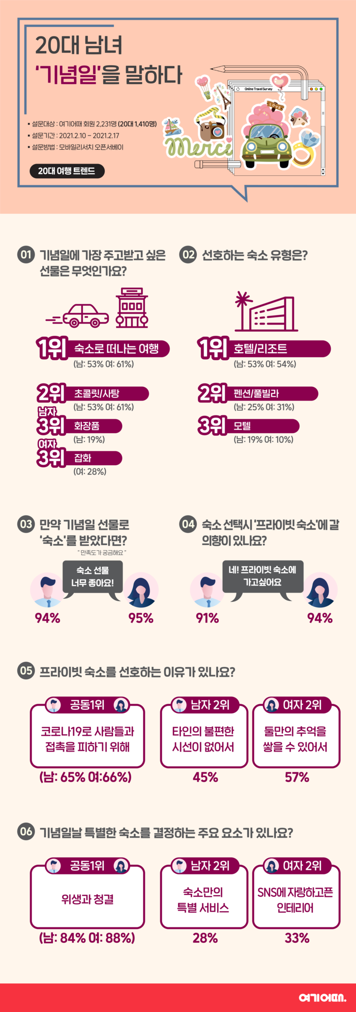 한편, 이번 설문은 모바일리서치 오픈서베이를 활용해 지난 10~16일 진행됐다. 여기어때 이용자 총 2231명이 참여했으며, 이 중 20대는 1410명이었다.