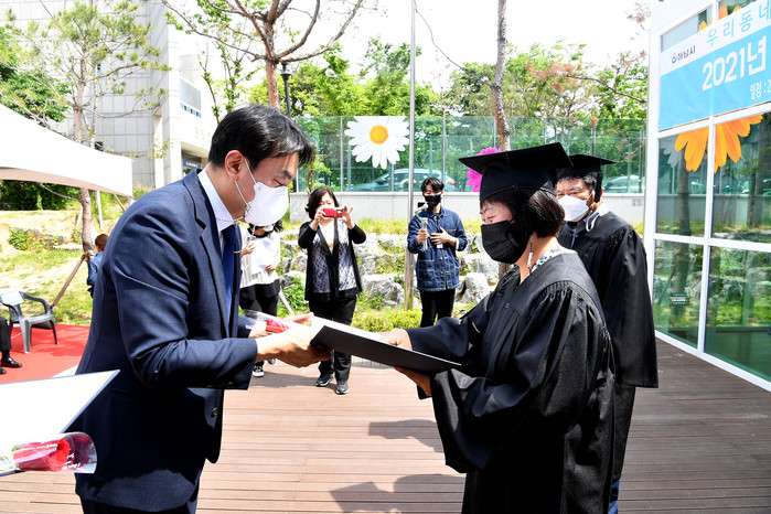 경기 하남시는 최근 올해 상반기 도시재생대학 수료식을 열었다. 상반기 도시재생대학은 지난 3월9일부터 8주에 걸쳐 맞춤형 교육과정 운영해 총 54명 수료생 배출했다. 사진은 수료식에서 김상호 시장(왼쪽)이 수료생에게 수료장을 전달하고 있는 모습. (사진제공=하남시청)