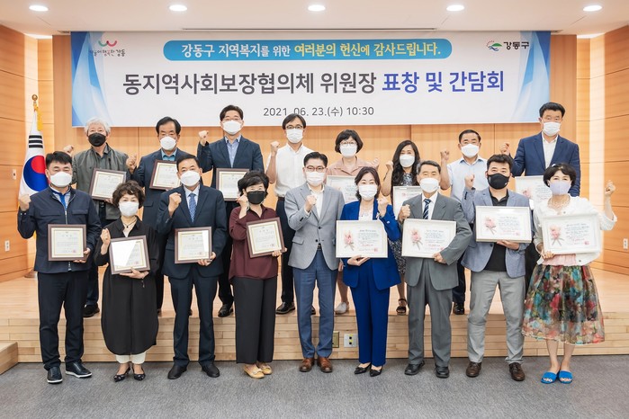 서울 강동구는 ‘동 협의체 민간위원장 네트워크’ 정식 출범 후 첫번째 시작으로 최근 동 지역사회보장협의체 민간위원장 네트워크 간담회를 열었다. 사진은 이날 이정훈 구청장(가운데)이 지역복지를 위해 헌신한 동지역사회보장협의체 위원장들에게 표창을 수여하고 기념촬영을 하는 모습. (사진제공=강동구청)
