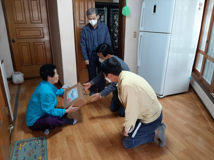 성동구 용답동 주민센터가 최근 제24회 노인의 날을 맞아 지역내 홀몸노인 및 저소득층 노인을 방문해 지원물품을 전달했다. 사진은 주민센터 관계자들이 노인에게 KF94 마스크와 간식꾸러미, 축하카드가 든 선물세트를 전달하고 있는 모습. (사진제공=성동구청)