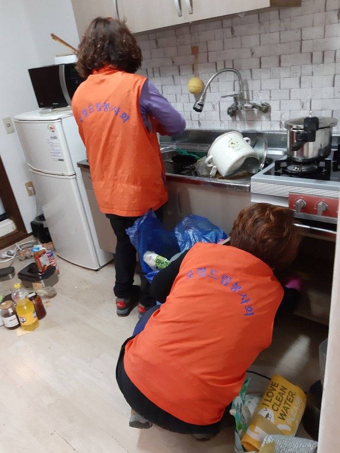 경기 동두천시 로컬드림봉사회는 최근 소요동에 거주하는 주거환경이 매우 열악한 고령의 홀몸노인 가정을 방문해 집안 청소 및 정리정돈 등 주거환경 개선 봉사를 실시했다. 사진은 봉사회 회원들이 주방을 정리하고 있는 모습. (사진제공=동두천시청)