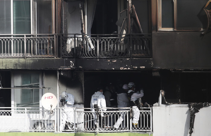 다수의 사상자가 발생한 경기도 군포시의 한 아파트 화재 현장에서 2일 오전 경찰과 경기소방재난본부, 국립과학수사연구원 등 관계자들이 화재 원인을 찾기 위한 합동 감식을 하고 있다. 지난 1일 이 아파트 12층에서 난 화재로 4명이 숨졌다. 또 1명이 중태에 빠지는 등 7명이 다쳤다.