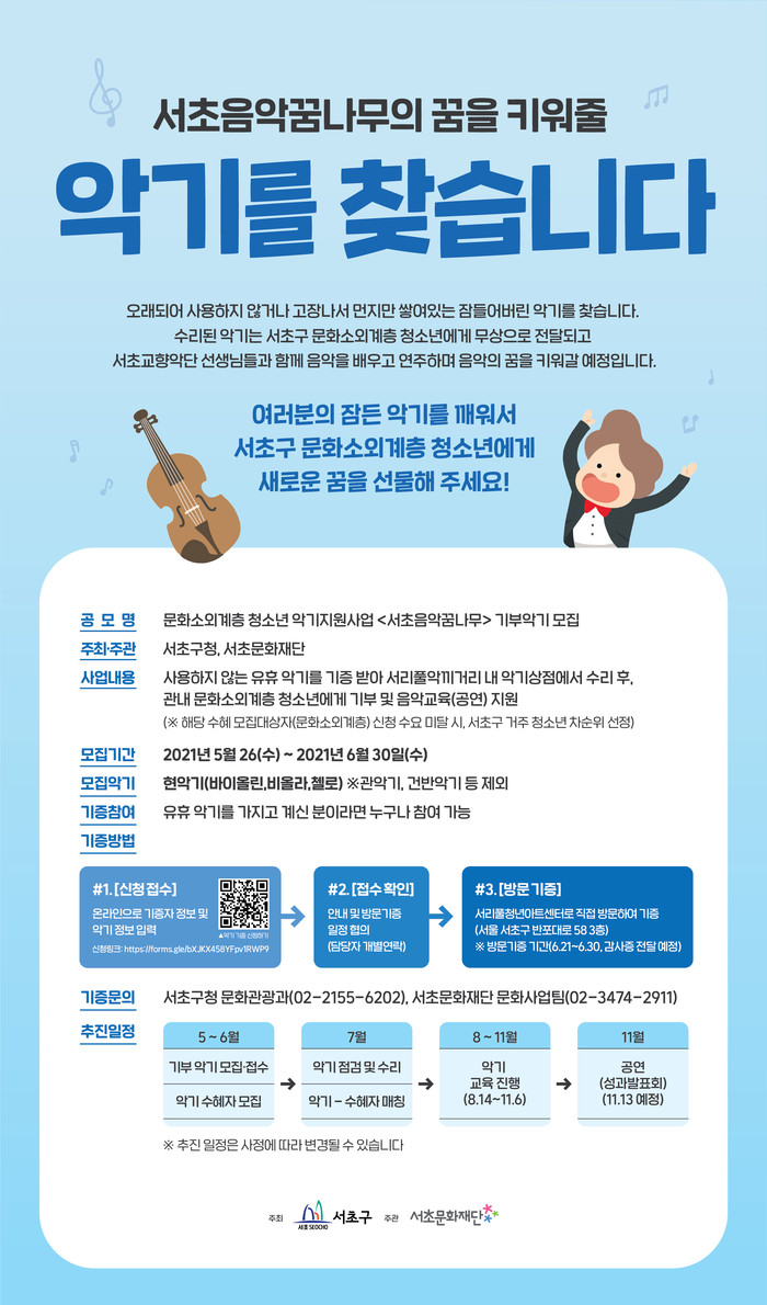 악기 기증은 오는 30일까지 서리풀악끼거리 홈페이지에서 온라인 접수 및 전화로 신청할 수 있으며, 악기 기증자에게는 기증에 대한 감사의 마음을 담아 ‘기증 감사증’을 전달할 예정이다.