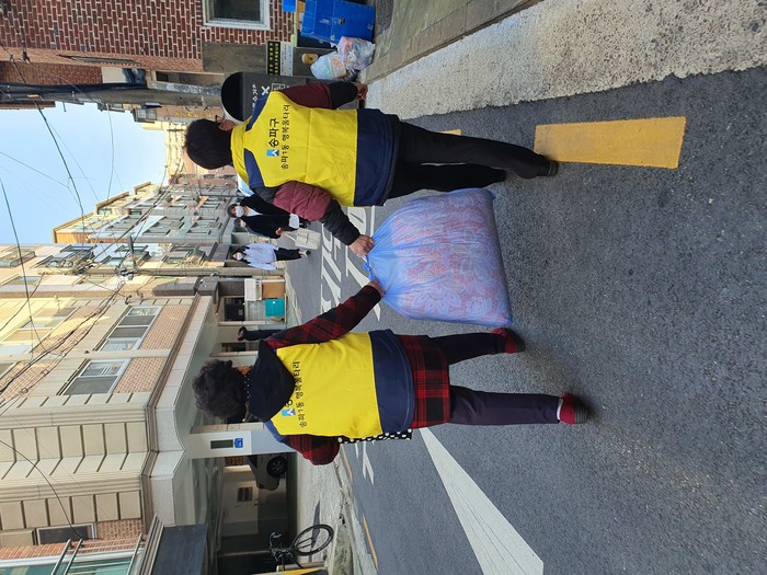 | ▲ 이불빨래를 수거하고 있는 봉사자들의 모습. (사진제공=송파구청) |
