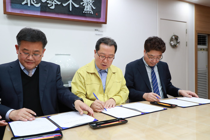 경기 남양주시가 2일 시장 집무실에서 지역내 주차난 해소를 위해 남양주도시공사, (주)한컴모빌리티와 사물인터넷(IoT) 공유주차 서비스 제공을 위한 업무협약을 체결했다. 사진은 조광한 시장(가운데)과 양 기관 관계자들이 협약서에 서명하는 모습. (사진제공=남양주시청)