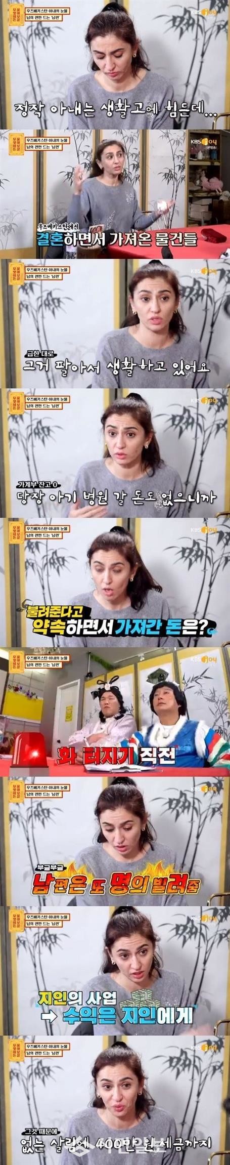 이어 "아기 병원 갈 돈도 없어서 제가 우즈베키스탄에서 가져온 걸 하나씩 팔아서 썼다"라며 "제가 아끼면서 모은 2,000만 원도 남편이 주식한다고 없앴다. 그런데 남편이 또 명의를 빌려줘서 회사를 차렸더라. 세금을 내라고 400만 원 고지서가 날라온다"라고 말해 충격을 안겼다.