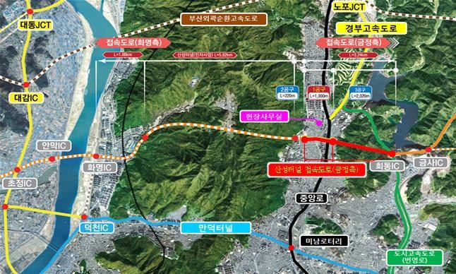 산성터널 금정측 접속도로는 부산시 금정구 장전초등학교~회동나들목(IC) 구간에 걸쳐 폭 20~50m의 도로로 지하차도와 터널, 교량 등 총연장이 3.24㎞에 달한다. 이는 부산시의 동과 서를 잇는 대표적인 연결 도로망 중 하나로 국비 1,256억 원, 시비 1,706억 원, 총 2,962억 원을 투입해 지난 2013년 8월에 착공하였으며 오는 4월 개통을 목표로 공사하고 있다.