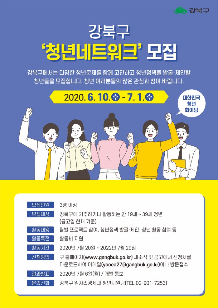 [시민일보 = 홍덕표 기자] 서울 강북구(구청장 박겸수)가 10일부터 오는 7월1일까지 청년 정책을 발굴하고 제안할 '강북 청년네트워크' 위원을 모집한다.