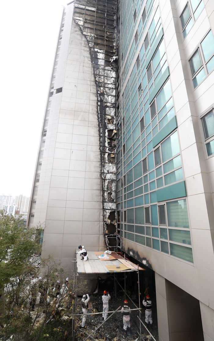 11일 오전 울산시 남구 삼환아르누보 주상복합아파트 3층 테라스에서 울산지방경찰청 수사전담팀과 국립과학수사연구원, 소방, 관계 기관 등이 참여하는 합동 감식이 진행되고 있다. 3층 테라스 외벽에서 위층으로 올라갈수록 불길이 'V'자 형태로 번진 흔적이 건물에 남아 있다.