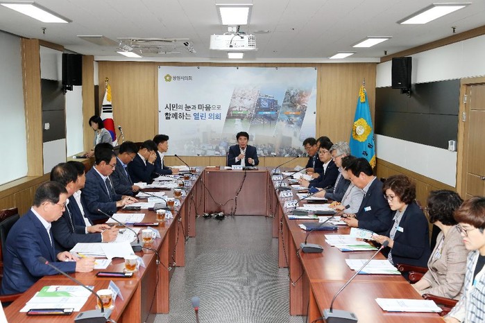 경남 창원시의회는 최근 의회 소회의실에서 이찬호 의장을 비롯해 의장단, 안병오 기획예산실장 등 간부공무원이 참석한 가운데 '시의회와 집행부간 소통·협력 강화를 위한 의장단 간담회'를 개최했다. 사진은 지역내 주요현황 등을 논의하며 협력 방안을 논의하고 있는 모습.