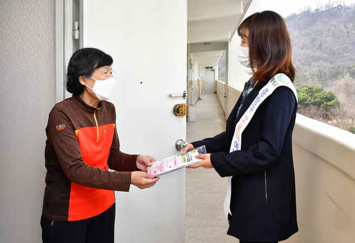 서울 중랑구가 코로나19로부터 지역내 노인들을 보호하고 마스크 착용의 중요성을 강조하기 위해 3일부터 지역내 만 65세 이상 노인 6만9000여명을 대상으로 인당 KF94 마스크 5장을 직접 방문해 전달하고 있다. 사진은 신내2동 주민센터 담당자가 마스크 배부 대상 노인에게 마스크를 배부하고 있는 모습. (사지제공=중랑구청)