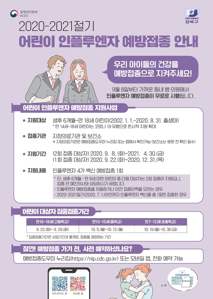 [시민일보 = 홍덕표 기자] 서울 강북구(구청장 박겸수)는 코로나19와 독감의 동시 유행을 차단하기 위해 '인플루엔자 무료 예방접종'을 확대 운영한다고 9일 밝혔다.