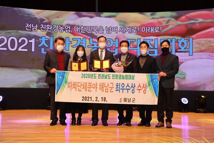 친환경 농업대상 최우수기관 선정은 2년 연속으로, 시상식은 18일 전남도청에서 2021년 친환경농업 다짐대회에서 열렸다. 해남군은 지자체 기관표창 외에도 축산분야에서 북평면 김소영씨가 최우수상을 수상하기도 했다.