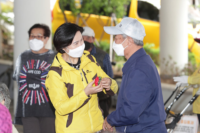 김수영 서울 양천구청장이 6일 서서울어르신복지관 어버이날 기념행사에 참석했다. 행사에서는 노인 150명에게 카네이션을 달아주고, 소나기봉사단이 제작한 비즈 마스크 목걸이와 특식 도시락을 제공했다. 사진은 이날 참석한 김 구청장(왼쪽)이 한 노인에게 카네이션을 달아주고 있는 모습. (사진제공=양천구청)