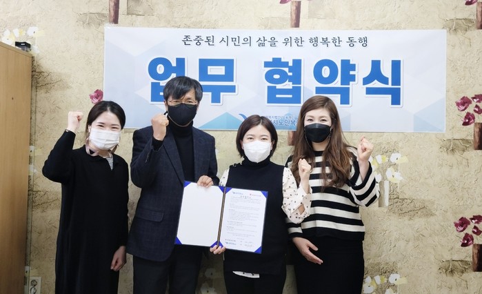 경기 포천시노인복지관은 지난 18일 케이뷰티아트교육원과 홀몸노인 지원을 위한 업무협약을 체결했다. 이번 협약은 지역내 홀몸노인들에게 토탈뷰티(미용·네일케어·스킨케어) 서비스를 제공하고 지역 청소년들의 직업훈련 및 자원봉사 활성화를 위해 마련됐다. 사진은 협약식에서 관계자들이 기념촬영을 하고 있는 모습. (사진제공=포천시청)