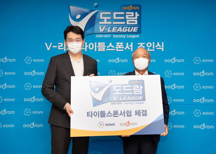 지난 6일 한국배구연맹 대회의실에서 열린 V-리그 타이틀 스폰서 조인식에는 박광욱 조합장과 조원태 총재가 참석해 올 시즌 대회 공식 명칭을 ‘도드람 2020~2021 V-리그’로 확정하고, 타이틀 엠블럼을 공개했다.