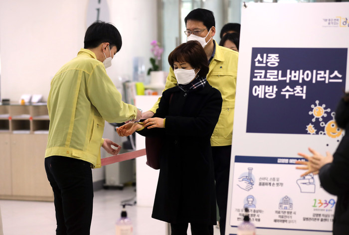 | ▲ 구청 출입구에서 민원인들의 발열체크를 하고 있는 모습. (사진제공=강남구청) |