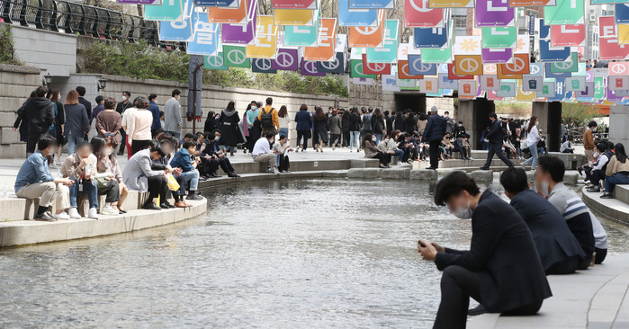 서울 낮 최고기온이 24도를 기록하는 등 초여름 날씨를 보인 1일 서울 중구 청계천에서 직장인들이 휴식하고 있다.