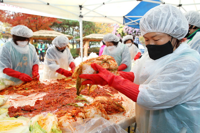18일 오전 서울 성동구청 앞 광장에서 열린 '저소득 이웃을 위한 김장담가주기 행사'에서 새마을부녀회, 지도자협의회 등 행사 참가자들이 직접 김치를 담그고 있다.