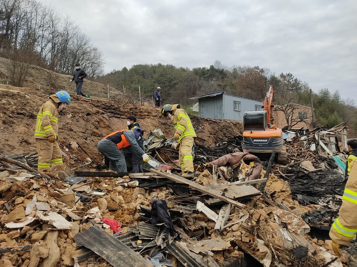 이에 소방공무원과 의용소방대원 등이 찾아가 굴착기와 폐기물 수거차량을 동원하여 화재 폐기물 제거 및 주변 청소를 돕고 빠른 일상복귀를 위한 구호제도도 안내했다.